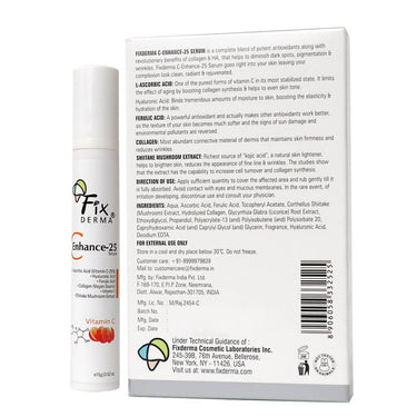 Fixderma C Enhance-25 SerumAbout the Product:A glow-boosting daily serum packaged with the goodness of Vitamin C has an advanced formula of anti-aging that reduces fine lines, dark spots, pigmentation, and wrinkles.Directions for Use:Clean your face and pat dry. Take 5 to 6 drops (approx. 1 ml) on your palm, apply to your face, and massage for 30-40 secs. Its quickly absorbed into your skin. Apply morning and evening preferably for quick and visible results.Legal Disclaimer: Product images are for illustrative purposes only. Images/packaging/ labels may vary from time to time due to changes made by the manufacturer's manufacturing batch and location. The product description is for information purposes only and may contain additional ingredients.Product ID:9096899