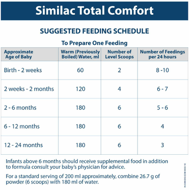 Similac Total Comfort Infant Formula Powder - Up to 6 MonthsIngredients: Maltodextrin Edible Vegetable Oils  Soy Lecithin Choline Chloride How to Use: Follow the suggested feeding schedule as given on the pack Use only the scoop enclosed in this tin to measure Similac Total Comfort powder. If you prepare more than one feeding, it must be refrigerated at 35 - 40F (2 - 4C) and used within 24 hours. Once feeding begins, use within 1 hour or discard. Legal Disclaimer: Product images are for illustrative purposes only. Images/packaging/ labels may vary from time to time due to changes made by the manufacturer's manufacturing batch and location. The product description is for information purposes only and may contain additional ingredients. Product ID:12846578